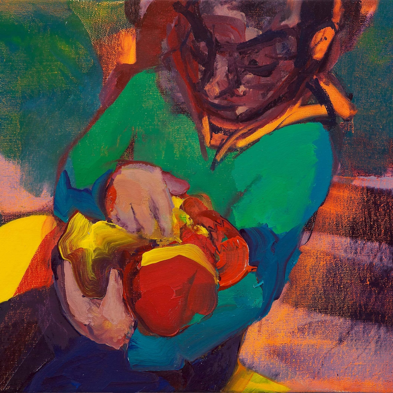 Objects become subjects, still lifes take form through an unusual visual syntax that tends to deny identity in order to exalt plastic form and make it the focus with vigorous use of colour. Michael Ajerman’s figure live in an apparently static state, in which the interrupted action of the bodies is examined by the expressionistic power of colour, which is in turn characterised by use of a warm, earthy, enthralling colour palette, visible on the canvas in the form of broad, solid brushstrokes which allow us to perceive the profoundly gestural nature of the act of painting and the pastiness of the colour (A. D’Amico).