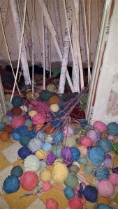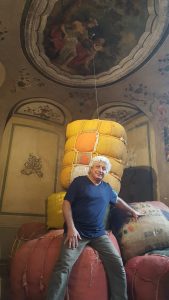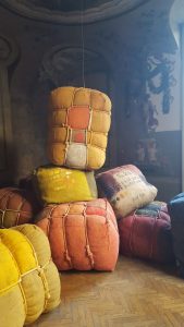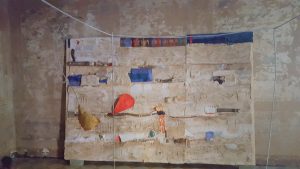 Medhat Shafik ha realizzato un’installazione site-specific ispirata al caravanserraglio, il luogo in cui nei paesi del Mediterraneo i mercanti si scambiavano le merci e allo stesso tempo le loro storie. Unendo alla pittura materiali e oggetti di recupero, in uno spazio evocativo e coinvolgente, l’artista affronta il tema, antico ed attualissimo, della confluenza dei popoli e del sincretismo delle culture. Shafik ci parla di identità e riflette sull’essere nomadi in un mondo globalizzato. Dice Shafik: “Noi siamo nomadi del mondo, con saggezza ogni viaggiatore si porta dietro la sua casa e le sue storie, il suo scrigno di sogni da offrire nei mercati come si scambiano le provviste. Ogni granello che raccogliamo diventa provvista, diventa la tua casa perché con la globalizzazione siamo diventati cittadini del mondo. La mia città è un luogo di scambi: non solo di sacchi di provviste, zenzero, spezie, pistacchi, nei bazaar, ma, seduti sulle stuoie, di storie scambiate. Il mio racconto io lo offro agli altri in un’agorà mentale..” Nelle diverse sale di Palazzo Martinengo, Shafik ha realizzato quattro diverse installazioni.